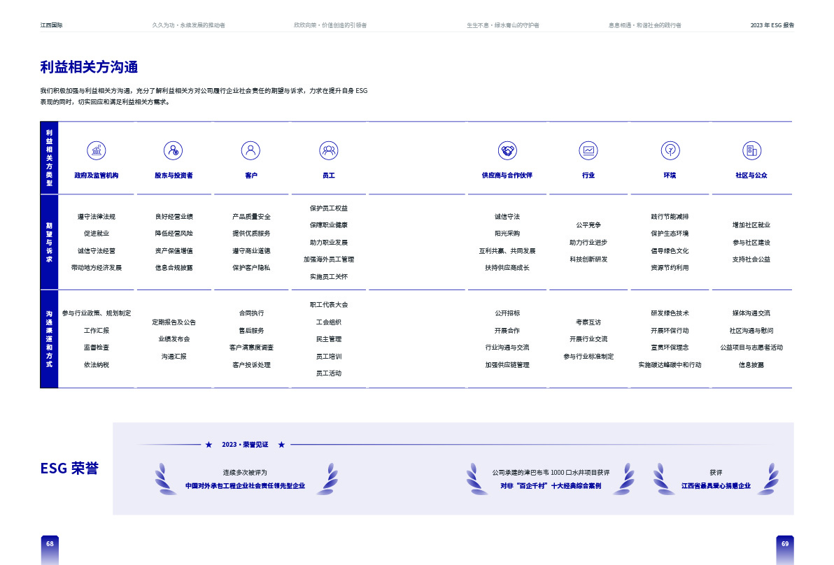 搜索 中江学堂 企业邮箱 EN 首页 关于我们 公司概况 组织架构 领导致辞 历程与荣誉 管理团队 新闻中心 集团新闻 媒体报道 媒体中心 对外交流 业务领域 业务布局 国际承包工程 投资业务 国内建筑工程 房地产开发 建筑设计与咨询 矿产资源开发 其他业务 党的建设 党建工作 党风廉政 信息公开 公告信息 采购信息 校园招聘 社会责任 属地化经营 ESG手册 乡村振兴 志愿者服务 企业文化 价值理念 文化手册 员工风采 合规倡议书 联系我们 首页 关于我们 公司概况 组织架构 历程与荣誉 管理团队 对外交流 新闻中心 集团新闻 媒体报道 媒体中心 业务领域 业务布局 国际承包工程 投资业务 房地产开发 国内建筑与建筑设计 矿产资源开发 海外贸易与劳务合作 党建创新 党建工作 纪律检查 社会责任 属地化经营 乡村振兴 志愿者服务 公益动态 企业文化 核心价值观 员工风采 校园招聘 联系我们 首页> 社会责任> ESG手册 © 2020 版权所有:中国江西国际经济技术合作有限公司 备案/许可证号:赣ICP备05000744号