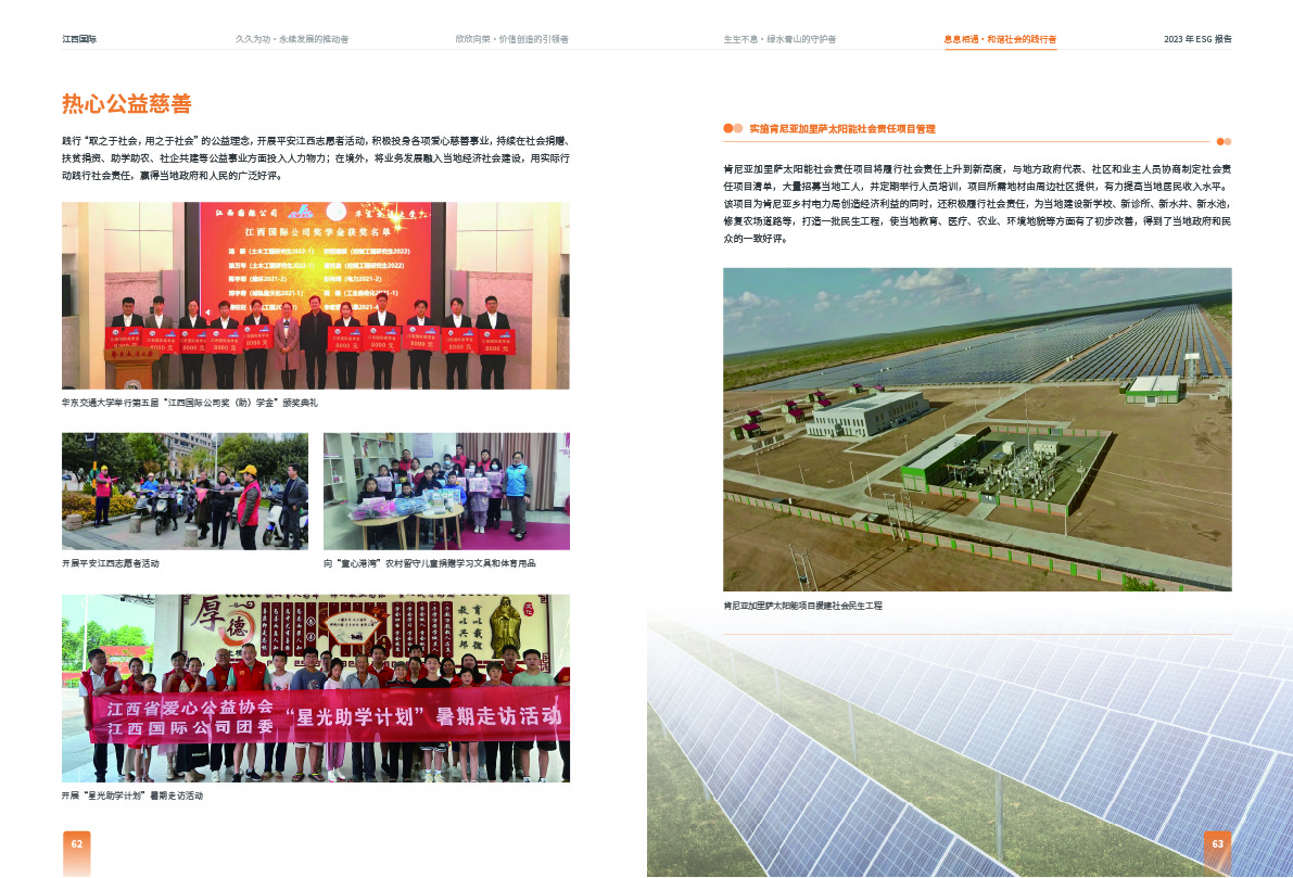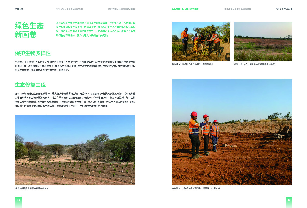 搜索 中江学堂 企业邮箱 EN 首页 关于我们 公司概况 组织架构 领导致辞 历程与荣誉 管理团队 新闻中心 集团新闻 媒体报道 媒体中心 对外交流 业务领域 业务布局 国际承包工程 投资业务 国内建筑工程 房地产开发 建筑设计与咨询 矿产资源开发 其他业务 党的建设 党建工作 党风廉政 信息公开 公告信息 采购信息 校园招聘 社会责任 属地化经营 ESG手册 乡村振兴 志愿者服务 企业文化 价值理念 文化手册 员工风采 合规倡议书 联系我们 首页 关于我们 公司概况 组织架构 历程与荣誉 管理团队 对外交流 新闻中心 集团新闻 媒体报道 媒体中心 业务领域 业务布局 国际承包工程 投资业务 房地产开发 国内建筑与建筑设计 矿产资源开发 海外贸易与劳务合作 党建创新 党建工作 纪律检查 社会责任 属地化经营 乡村振兴 志愿者服务 公益动态 企业文化 核心价值观 员工风采 校园招聘 联系我们 首页> 社会责任> ESG手册 © 2020 版权所有:中国江西国际经济技术合作有限公司 备案/许可证号:赣ICP备05000744号