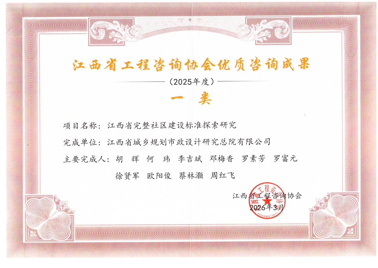 近日,公司下属江西省城乡规划市政设计研究总院有限公司(简称“省城规总院”)承担的厅级课题《江西省完整社区建设标准探索研究》,荣获“2025年度江西省工程咨询协会优质咨询成果一类奖”,标志着省城规总院在完整社区建设领域的创新研究与技术引领能力获得行业权威认可。 该获奖研究依托省城规总院规划二分院与省人居院联合编制并已在全省宣贯的《江西省完整社区建设指南(试行)》开展,其构建的“6类20项+N”指标体系等核心经验,被《中国建设报》作为江西典型做法宣传推广,为全省完整社区建设提供了系统指引。该研究成果细化完善了建设标准,创新“共建共享”“代际融合”建设模式,为各地住建部门及设计单位提供技术支撑,并指导赣州、九江、上饶等地编制地方性技术导则。同时,省城规总院深度参与九江修水、吉安安福、萍乡经开区三地社区建设全过程技术服务,相关案例成功入选江西省城市更新暨“好社区”建设典型案例,形成了“指南—标准—实践”的完整闭环体系。 未来,省城规总院将持续发挥专业技术优势,深化完整社区建设研究与实践,为江西省城市高质量发展贡献专业力量。