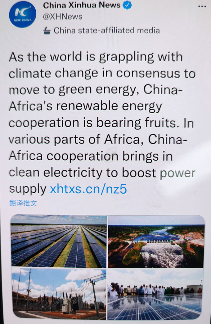 新华社在官方推特账号发布推文,指出中非可再生能源合作正在取得成果,在非洲不同地区,中非合作带来的清洁电力正促进当地电力供应,并肯定肯尼亚加里萨50兆瓦太阳能发电站为中非绿色能源合作所作的贡献。