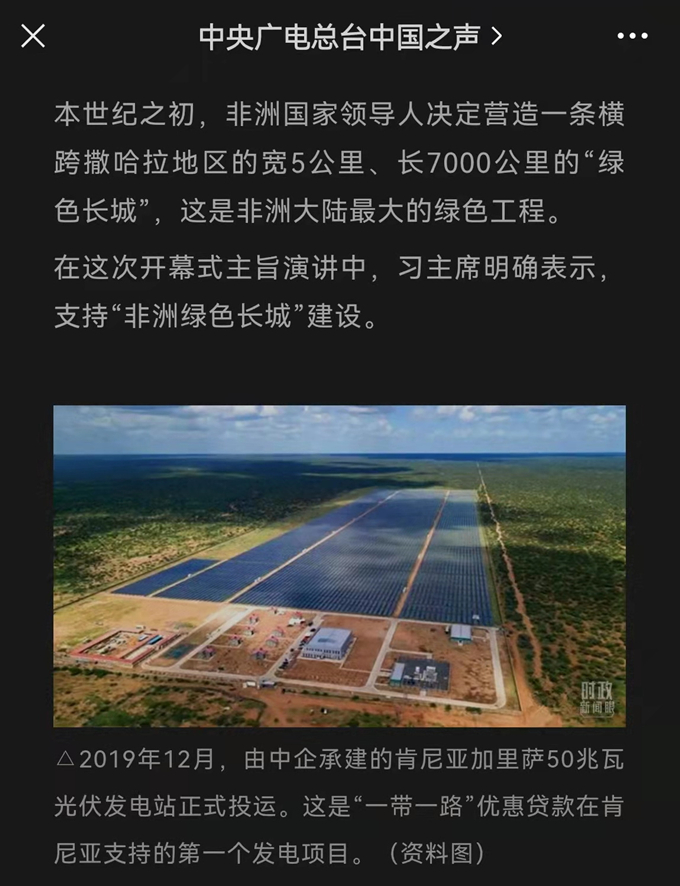 中央广电总台《时政新闻眼》专栏,刊登长篇通讯《为了中非27亿人民的福祉,习近平宣布共同实施“九项工程”》提到习近平主席明确支持“非洲绿色发展长城”建设,并配上肯尼亚加里萨50兆瓦太阳能发电站图片,指出该项目是“一带一路”优惠贷款在肯尼亚支持的第一个发电项目。