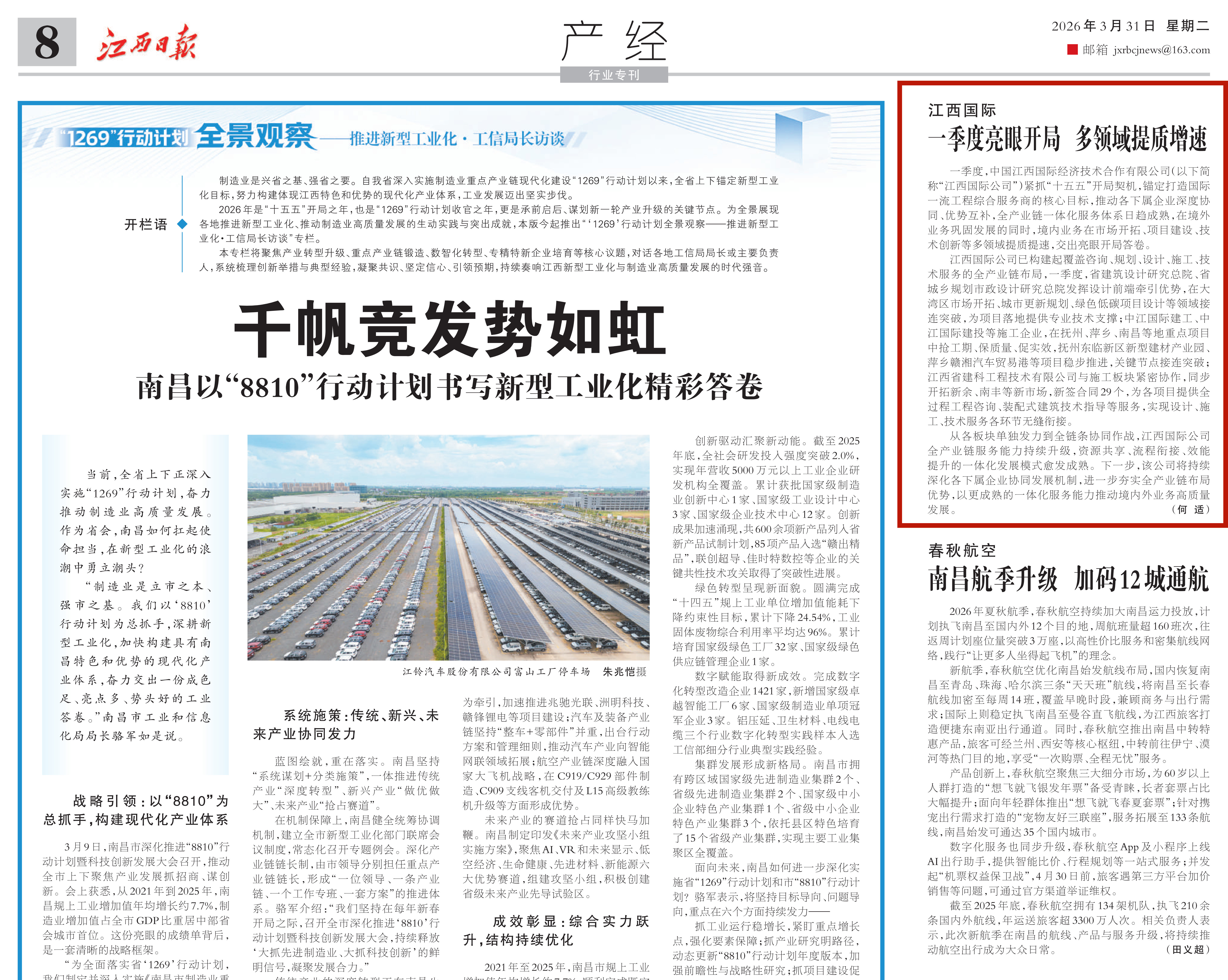 3月31日,江西日报聚焦公司一季度发展成效,刊发题为《江西国际一季度亮眼开局 多领域提质增速》的报道,点赞公司紧抓“十五五”开局契机,锚定打造国际一流工程综合服务商目标,推动各下属企业深度协同、优势互补,全产业链一体化服务体系日趋成熟,境内外业务同步提质提速,实现一季度亮眼开局。原文转载如下: